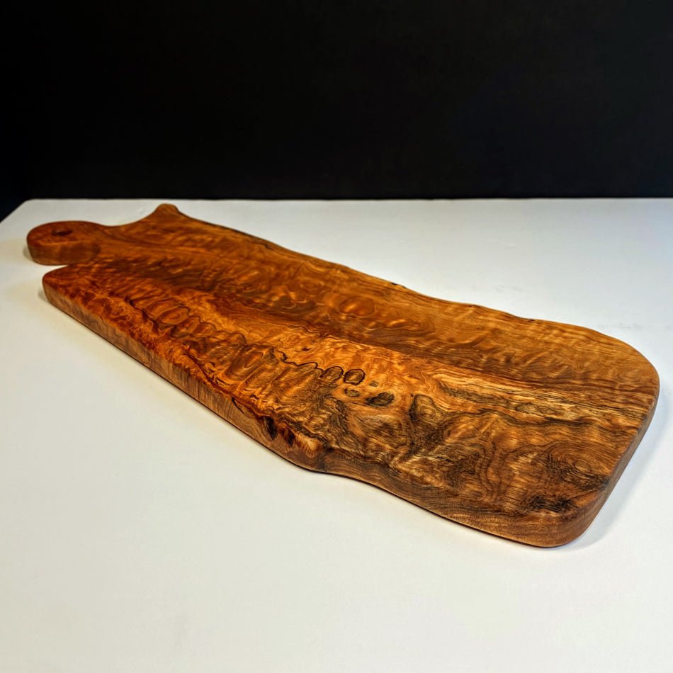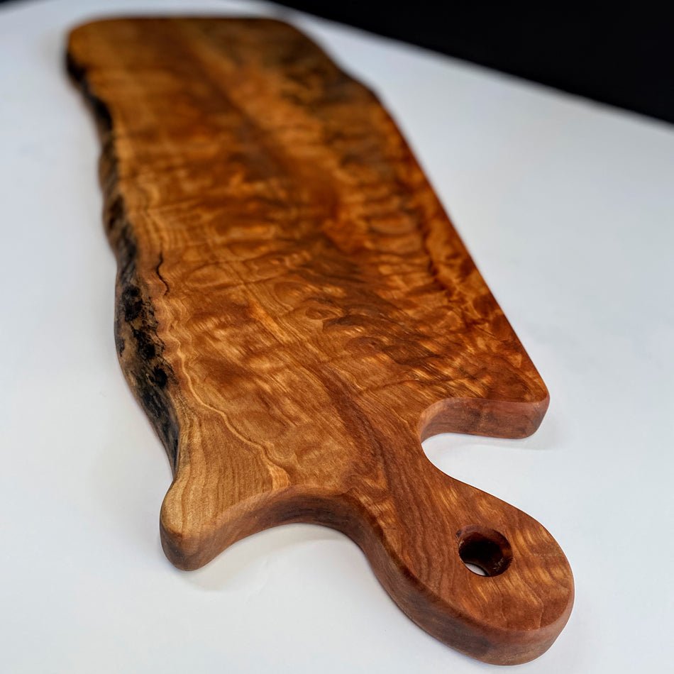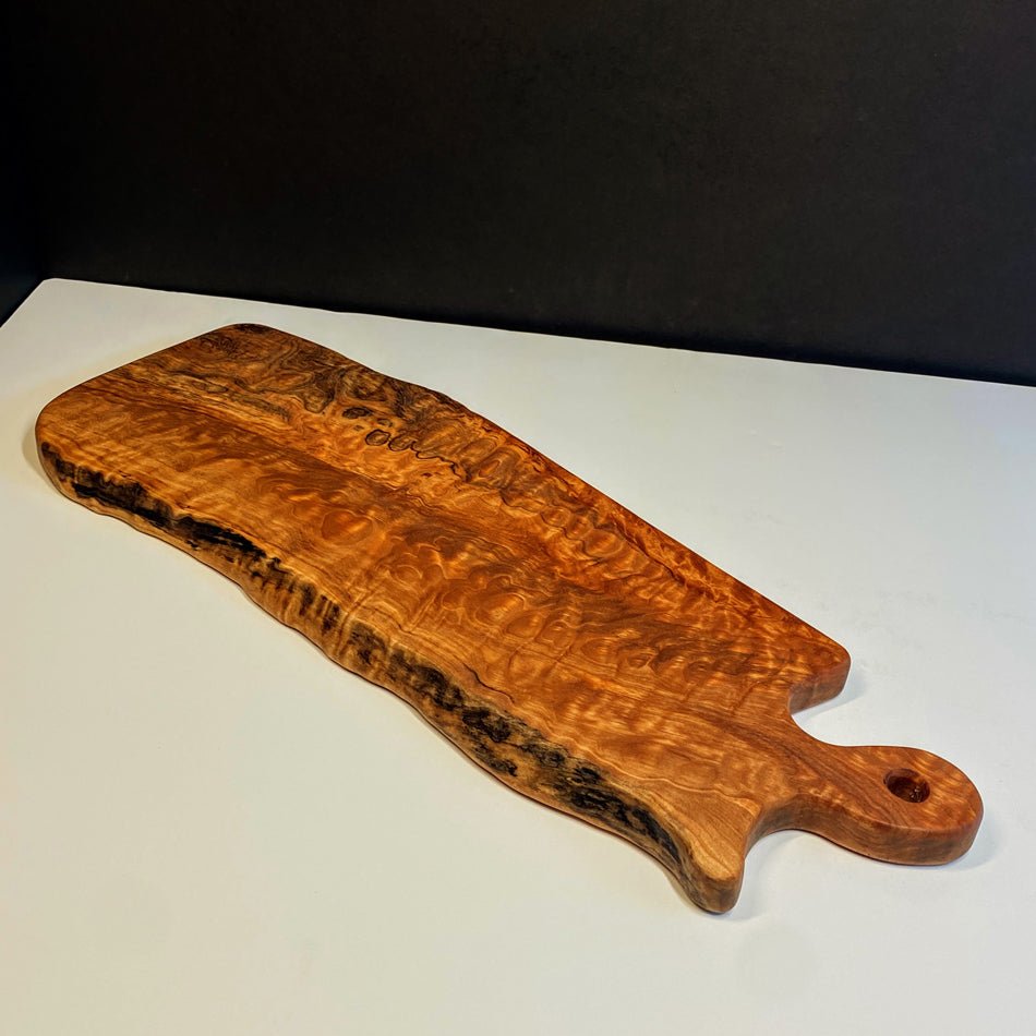This Board is crafted with Live Edge Quilted Maple, featuring intricate detail to maintain its live edge, elegance and striking grain. Quilted Maple is remarkable, showcasing an abundance of captivating colors and ample space, perfect for displaying an exquisite charcuterie board.
