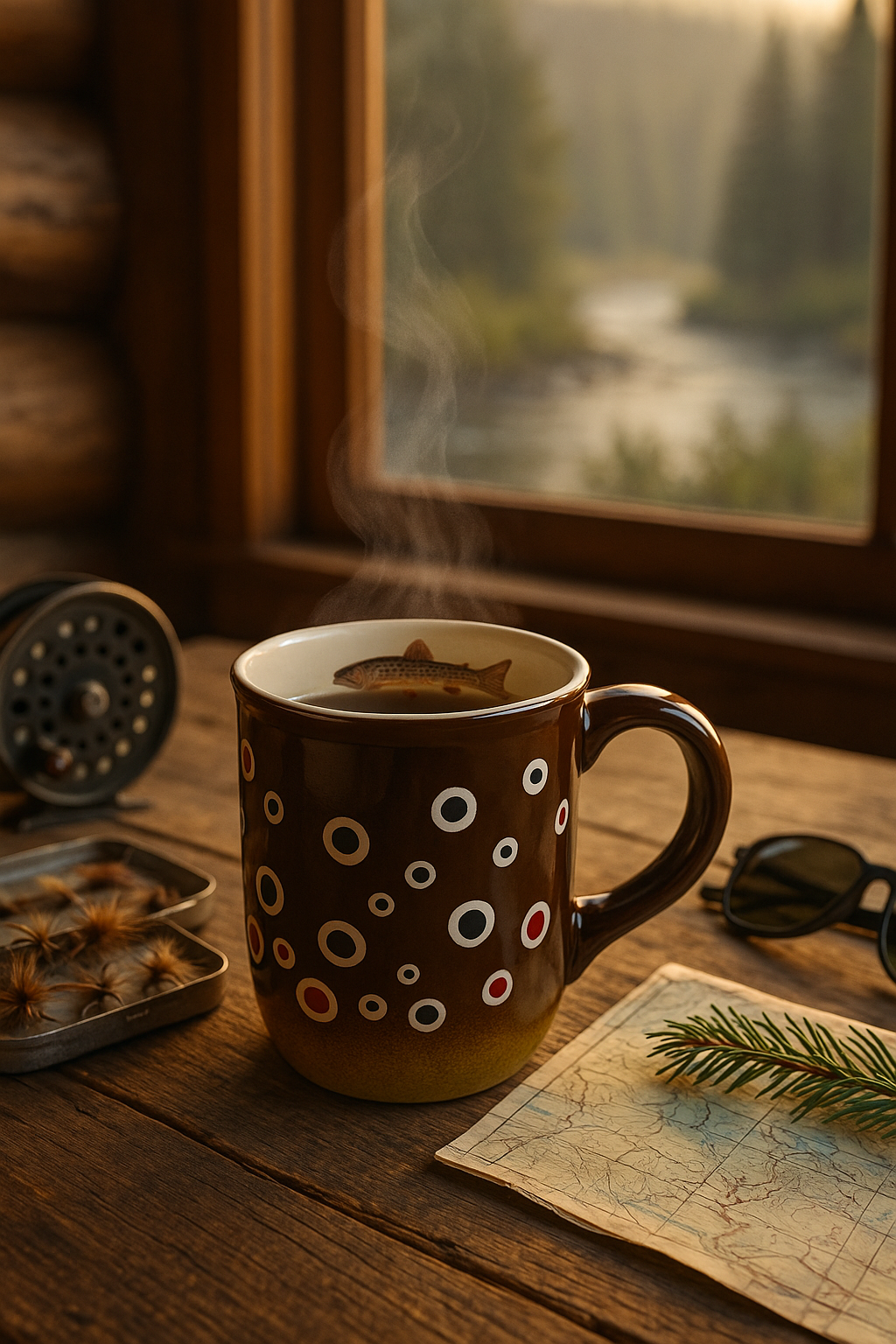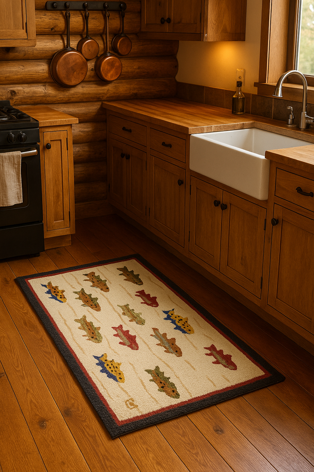 Hand-hooked wool lumbar pillow with bright trout artwork on cream background