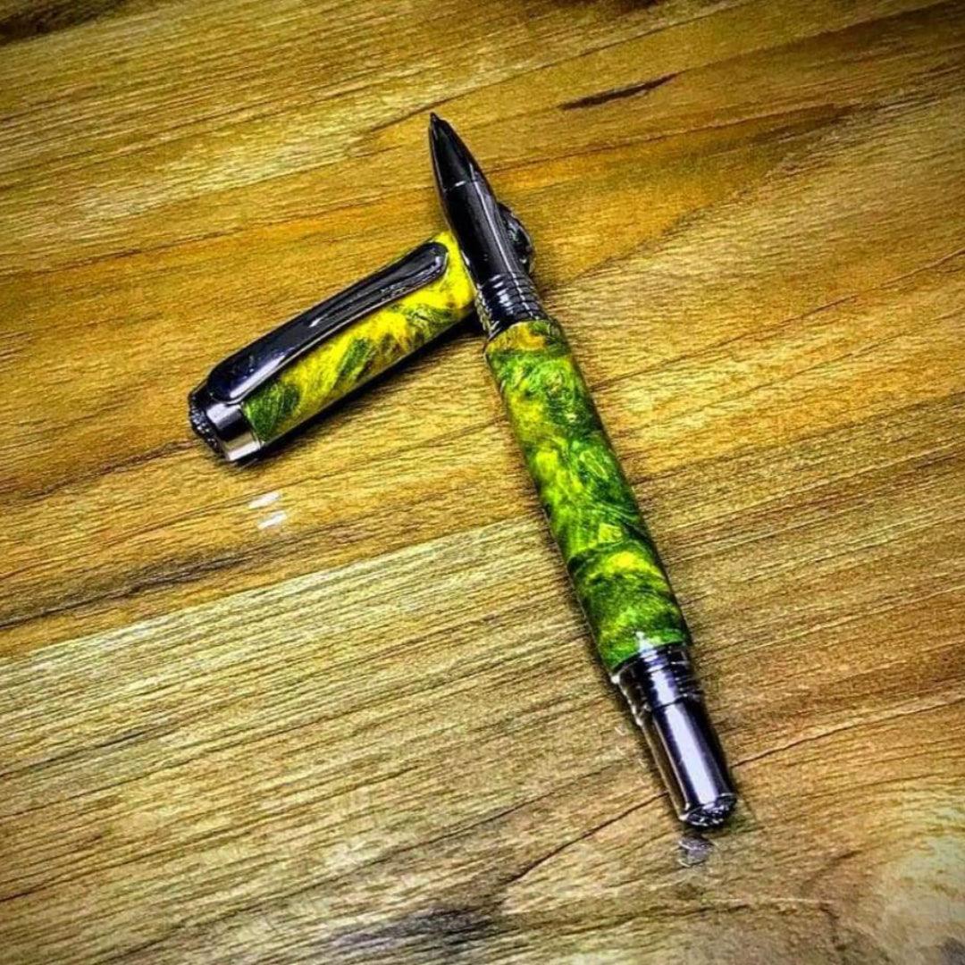 The Jr. Aaron has the corporate executive in mind. The Jr. Aaron’s elegantly engraved leaf insets on the cap, the center band, and barrel ends of rhodium make up the highest quality components. In the custom of some of the finest pens, the Jr. Aaron’s postable design, box elder burl promotes a perfect balance and an effortless writing experience.