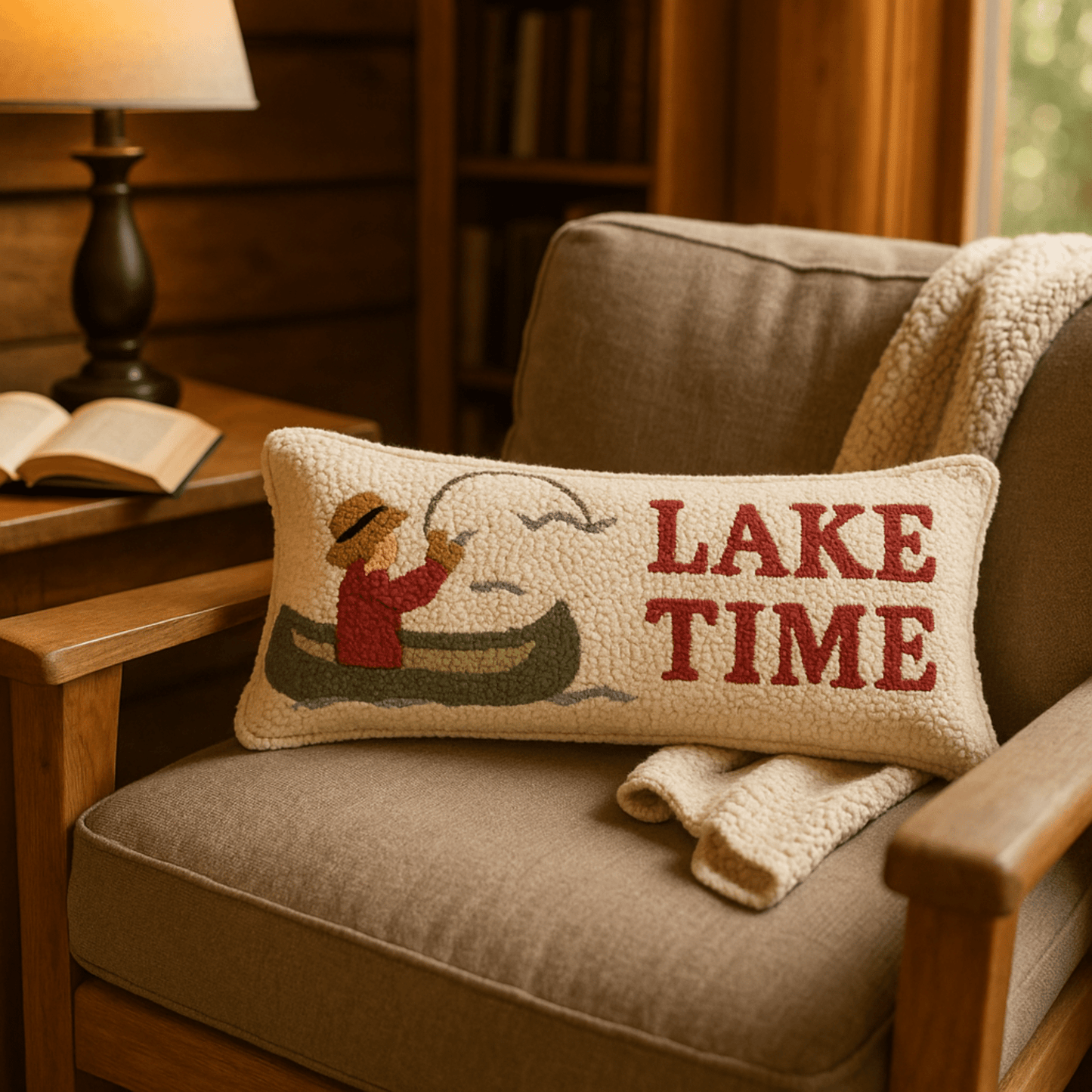 Lake House Lumbar Pillow - Hand - Hooked Wool 8x24K - Fish On! Custom Rods